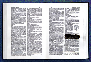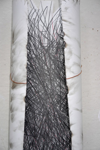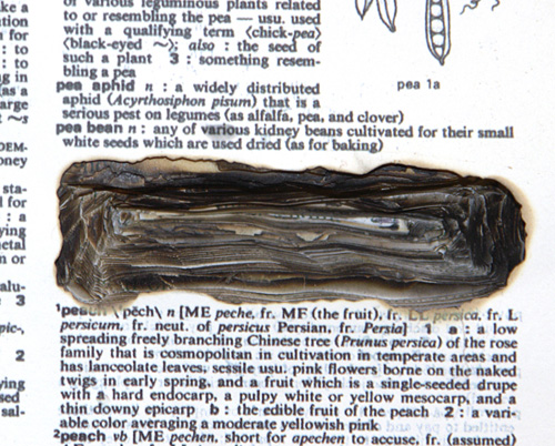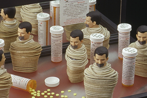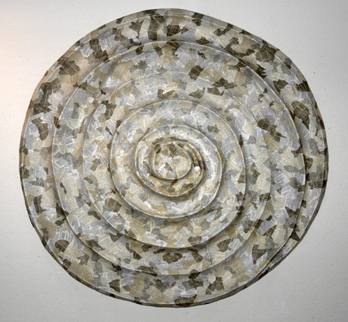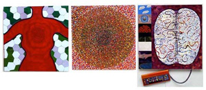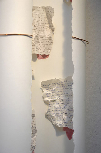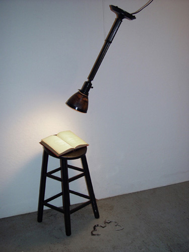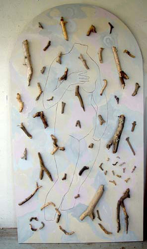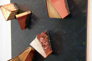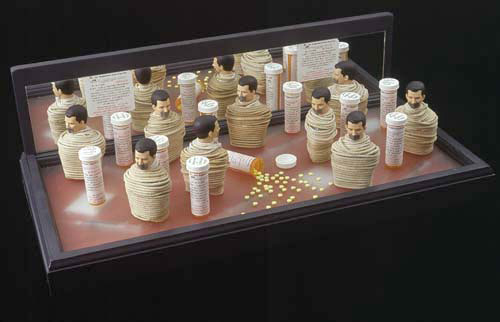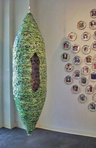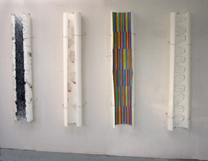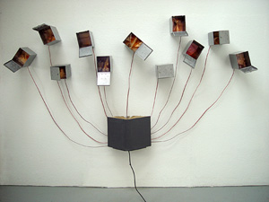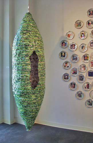 The mixed- media works employ everyday objects as the physical media, subject, and as metaphor, to explore both